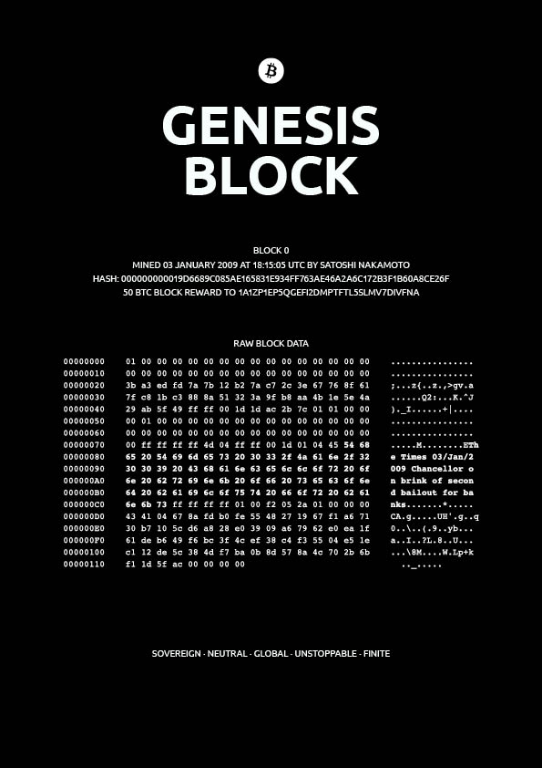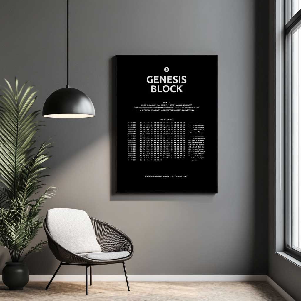Das Poster visualisiert die originalen Daten des Blocks einschließlich des eingebetteten Zeitungstextes aus The Times, des Block Hashes, der Block Reward Information sowie der bekannten Coinbase Adresse. Die Darstellung folgt einer technisch korrekten Struktur und orientiert sich an klassischen Hex Editor Ansichten, wurde jedoch bewusst kuratiert, um auch als Wandkunst zu funktionieren.
